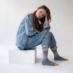La douceur du vieux tapis sous les pieds, la musique de chambre du papier peint. Le chat rayé et ses petits attendent sous l’arbre rose, et les hortensias fanés gardent leurs couleurs subtiles et un peu éteintes. Un couple à la Chagall s’étreint à quatre mains… Qui n’a pas besoin d’un gros câlin ? Des nuances de bleus et de gris froids qui rejoignent des nuances de roses et de gris chaud, les pointes colorées ravivent le tout.